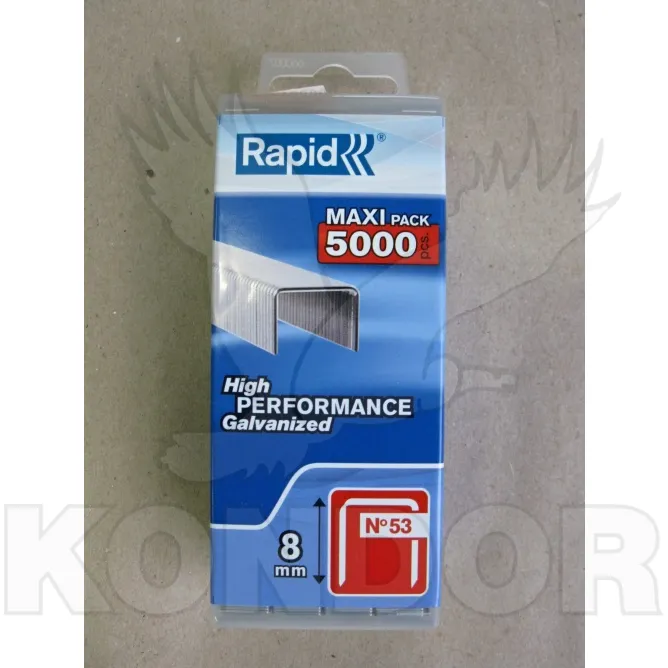 Spony do sponkovačky RAPID Typ 53. Sponky z jemného drátu. Ideální pro upevňování kůže, látek, etiket nebo pro čalounění. Šíře sponky 11,4 mm, síla drátu 0,75 mm, výška sponky 8 mm. Balení obsahuje 5000 ks.