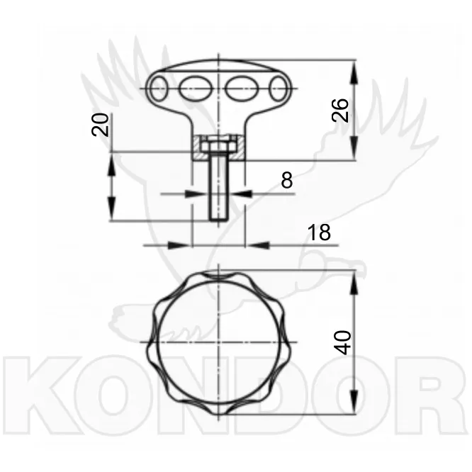 Šroub s plastovým ovládácím elementem ve tvaru růžice v černé barvě z materiálu PA 6. Materiál šroubu M 8 × 20 - pozinkovaná ocel.