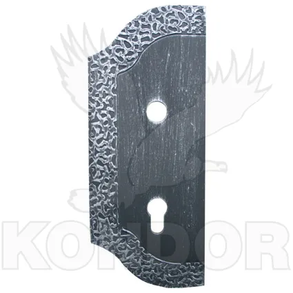 Ozdobný bránový štítek levý o výšce 268 mm, šířce 117 mm a tloušťce 3 mm. Otvor pro kliku o průměru 20 mm. Osový rozestup (klika–zámek) 90 mm. Otvor je vhodný pro zámek značky FAB. Bez povrchové úpravy.
