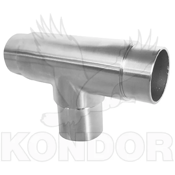 Spojka dvou madel D42,4 mm s napojením na sloupek D42,4 mm. Přímé spojení madel (tvar T). Nerez AISI304, povrchová úprava brus K320.