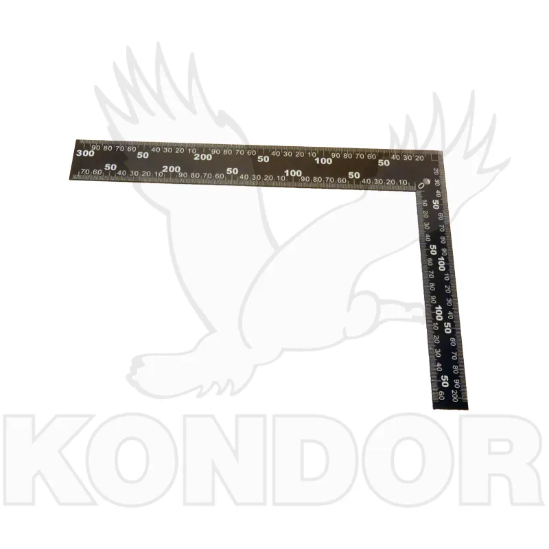 Kovový úhelník. Pevný úhel 90°. Obě ramena mají měřítko se stupnicí v mm. Rozměr 200 x 300 mm.