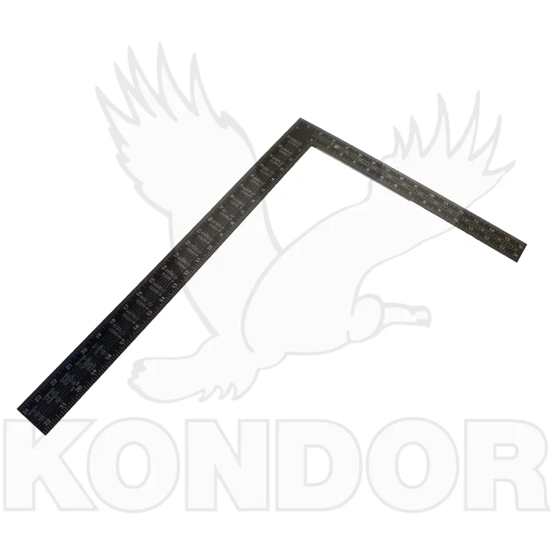Kovový úhelník. Pevný úhel 90°. Obě ramena mají měřítko se stupnicí v mm. Rozměr 400 x 600 mm.