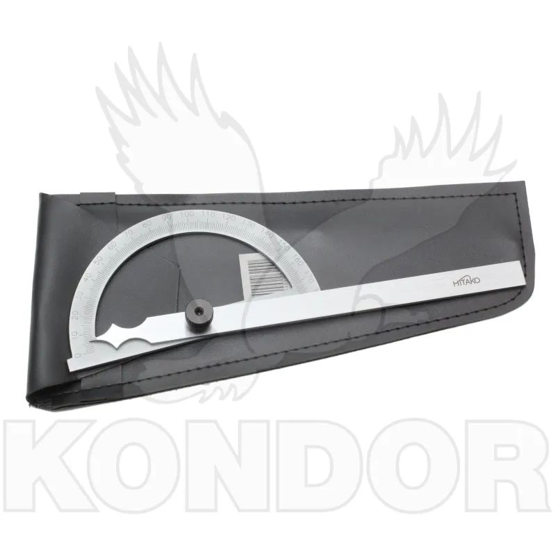 Určen pro měření úhlů ve většim rozsahu. Vhodný pro zámečnické práce. Základna úhloměru 120 mm. Rameno 210 mm. Aretace šroubkem s pružinou.