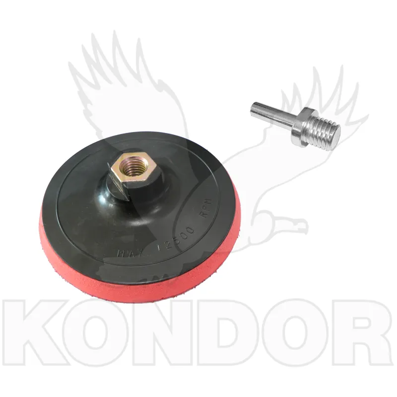 Silnější gumový kotouč je určen pro upnutí do úhlové brusky. Brusný kotouč se připevňuje pomocí suchého zipu. Průměr 125 mm. Závit M 14. Součástí balení je stopka pro uchycení do vrtačky.