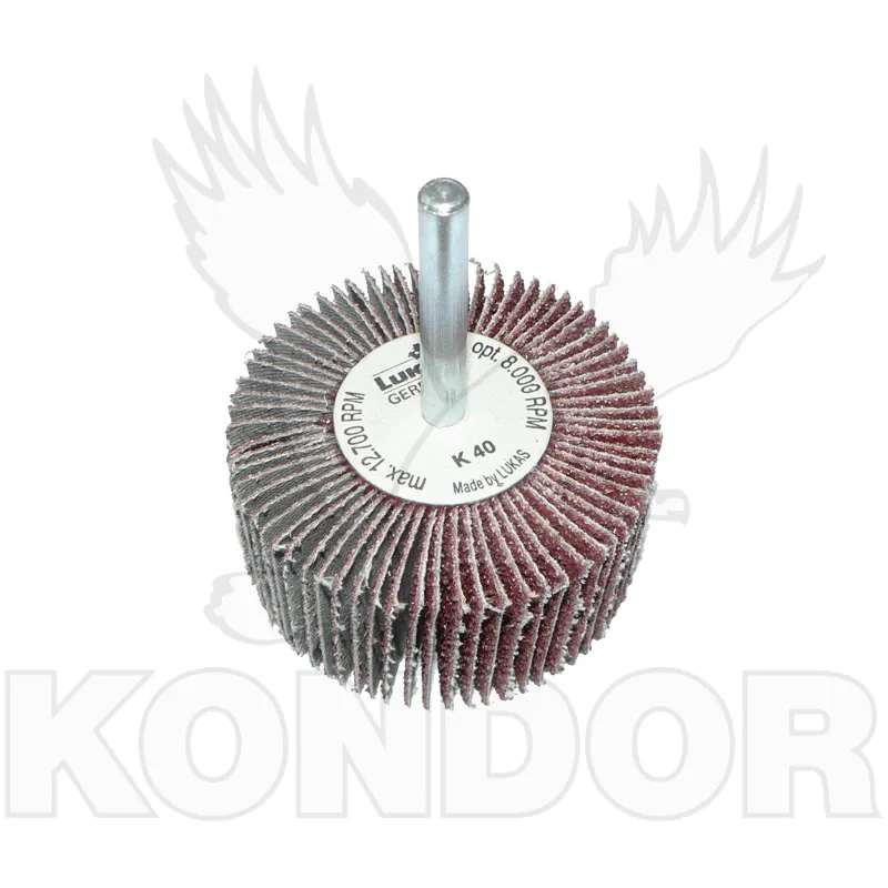 Lamelový brousící vějíř na kov se stopkou do vrtačky. Vějířové brousící nástroje mají funkční část vytvořenu z radiálně uspořádaných lamel upevněných ve středovém jádře. Nástroje jsou pouze pro pravý směr otáčení. Nástroje s širokým uplatněním při nejrůznějších pracovních činnostech od hrubého až po jemné broušení. Průměr nástroje 60 mm. Výška nástroje 30 mm. Průmět stopky 6 mm. Zrnitost kotouče P 40.