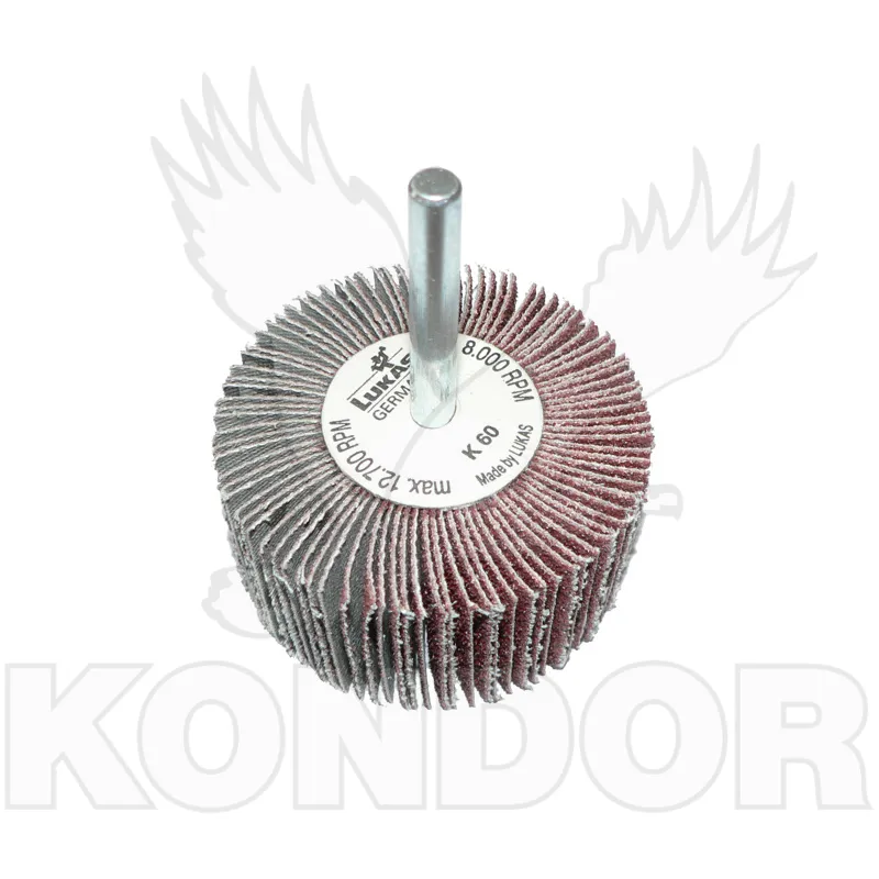 Lamelový brousící vějíř na kov se stopkou do vrtačky. Vějířové brousící nástroje mají funkční část vytvořenu z radiálně uspořádaných lamel upevněných ve středovém jádře. Nástroje jsou pouze pro pravý směr otáčení. Nástroje s širokým uplatněním při nejrůznějších pracovních činnostech od hrubého až po jemné broušení. Průměr nástroje 60 mm. Výška nástroje 30 mm. Průmět stopky 6 mm. Zrnitost kotouče P 60.