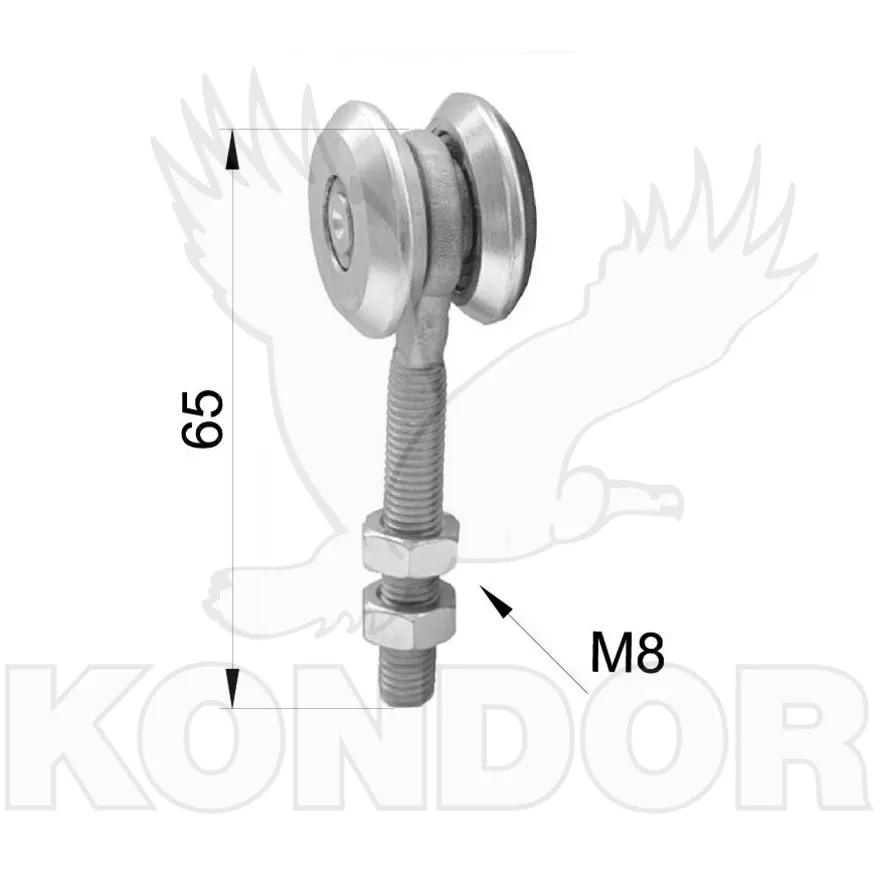 Závěsný vozík kolečkový s ložiskem pro posuvné závěsné brány. Žárově pozinkovaný. Závit M8. Výška 65 mm. Určený do profilu 33 x 34 x 2 mm v pozinkovaném nebo černém provedení. Maximální zatížení na jeden vozík je 30 kg, při dodržení maximální vzdálenosti držáků vodící kolejnice 700 mm.