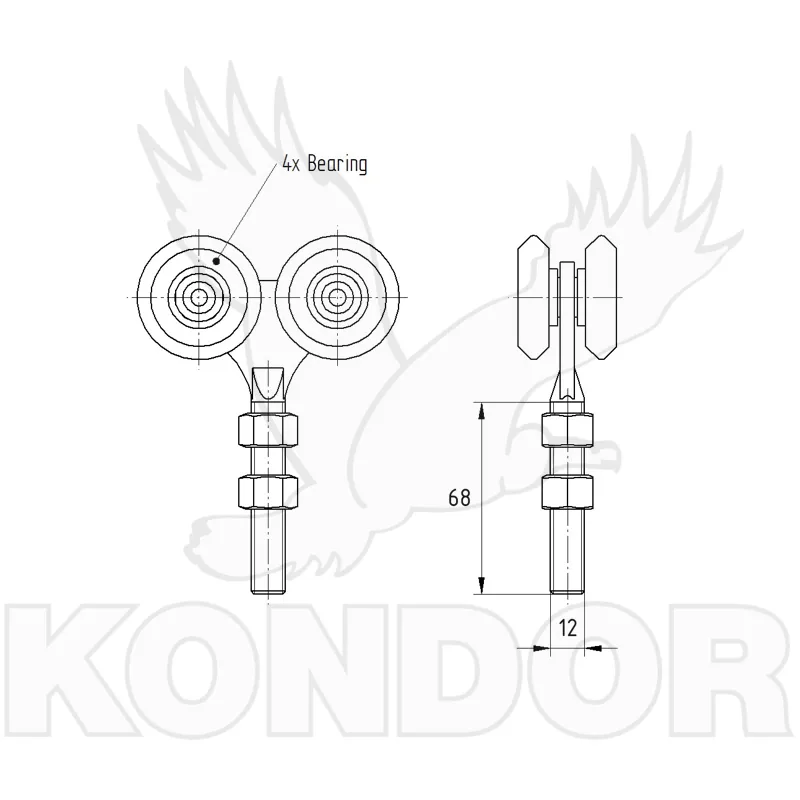Závěsný vozík čtyřkolečkový s ložiskem pro posuvné závěsné brány. Žárově pozinkovaný. Závit M12. Výška 125 mm. Určený do profilu 42 x 54 x 2,5mm v pozinkovaném nebo černém provedení. Maximální zatížení na jeden vozík je 200 kg, při dodržení maximální vzdálenosti držáků vodící kolejnice 700 mm.
