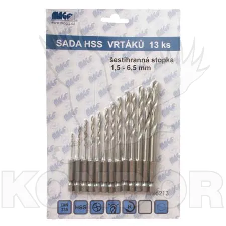 Sada univerzálních vrtáků HSS, se šestihrannám úchytem (vhodné do AKU vrtaček). 13 vrtáků velikostí 1,5–6,5 mm.