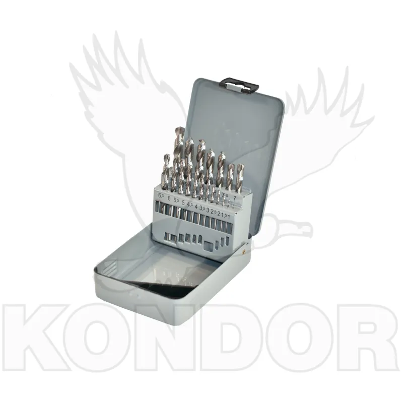 Sada 19 ks vybrušovaných vrtáků z rychlořezné oceli (HSS). Ideální k použití na kovy, ale i měkké materiály (dřevo, měď, guma, mosaz).