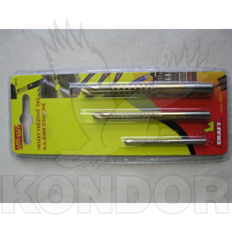 Sada frézových vrtáků na dřevo o průměru od 4 do 8 mm. Titanová úprava povrchu. Sada obsahuje 3 ks.