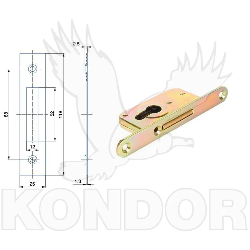 Zámek jednozápadový bez převodu je určený pro zadlabávání do dveří DORM 26. Oboustranné použití.