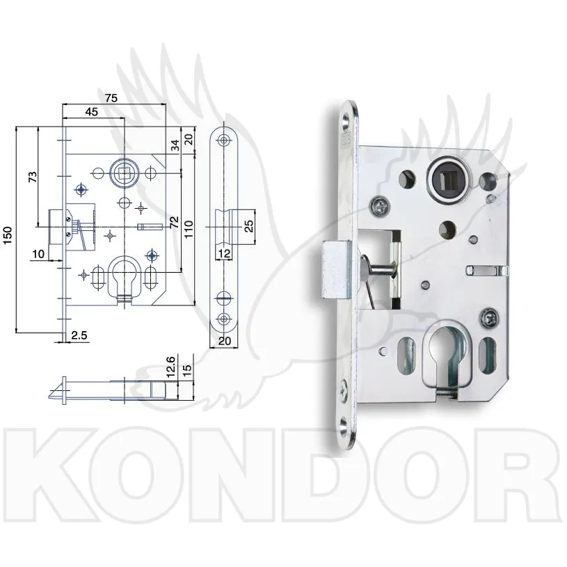 Zámek je určený pro zadlabání do dveří pro vložku DORM 45. Oboustranné použití.