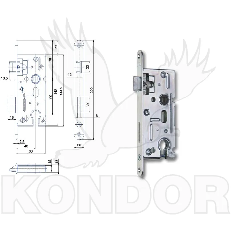 Zámek je určený pro zadlabávání do dveří DORM 40, k použití pro levou i pravou stranu.