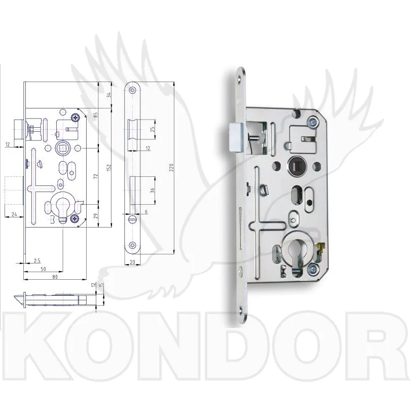 Dvouzápadový zámek s převodem určený pro zadlabávání do dveří DORM 50. Lze použití pro levé i pravé dveře.