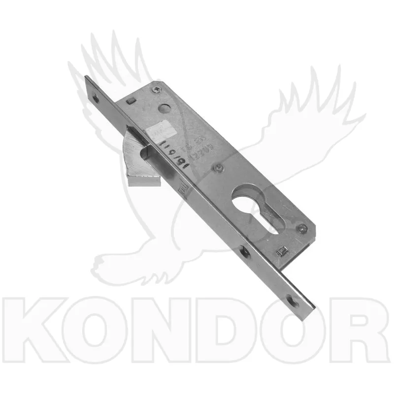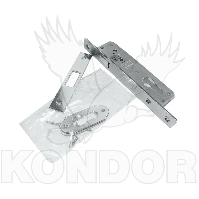 Zámek pro posuvné dveře. Výsuvná závora z těla zámku. Součástí je protiplech zámku a štítky.
