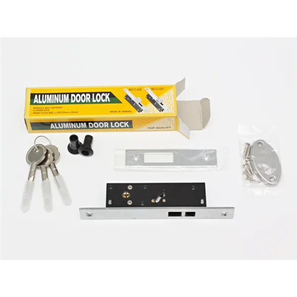 Zámek s vložkou bez kliky pro posuvné dveře. Výsuvná závora z těla zámku. Součástí zámku je vložka na trojhranný klíč, protiplech zámku a štítky.
