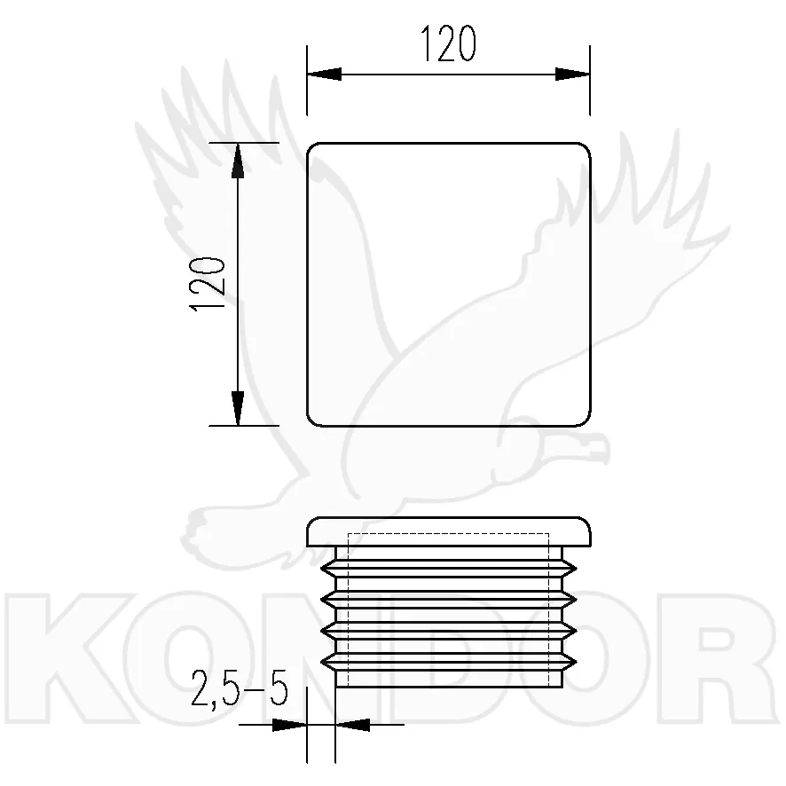 Plastová koncovka jeklu. Rozměry 120 x 120 mm. Možno nasadit na jekl o síle stěny 2,5–5 mm. Standardní barva je černá.
