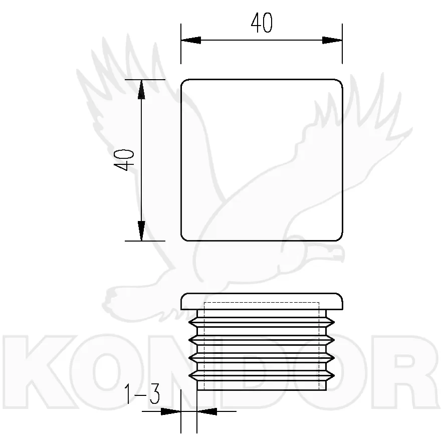 Plastová koncovka jeklu. Rozměry 40 x 40 mm. Možno nasadit na jekl o síle stěny 1–3 mm. Standardní barva je černá.