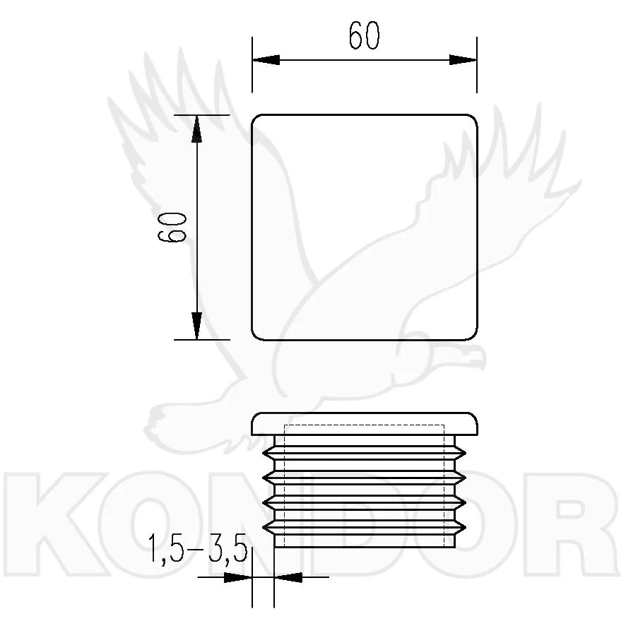 Plastová koncovka jeklu. Rozměry 60 × 60 mm. Možno nasadit na jekl o síle stěny 1,5–3,5 mm. Barva je šedá