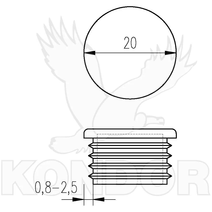 Zátka kruhového tvaru s plochou hlavou pro nasazení na konec ocelové trubky. Materiál plast. Průměr 20 mm. K nasazení na trubku o síle stěny 0,8–2,5 mm.