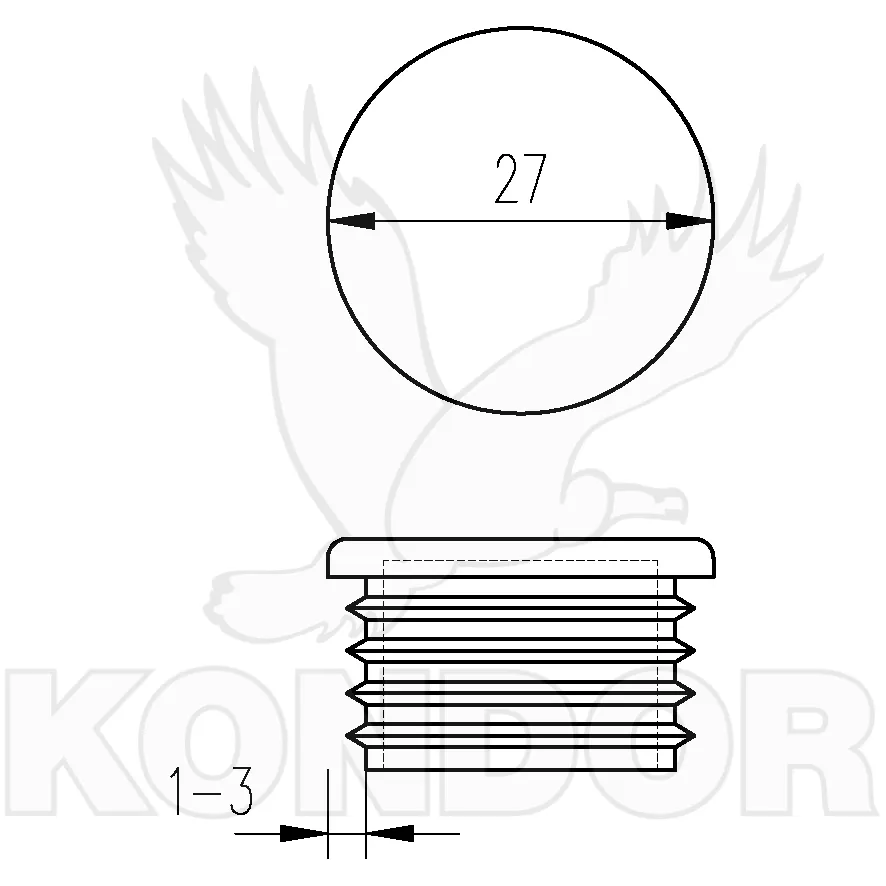 Zátka kruhového tvaru s plochou hlavou pro nasazení na konec ocelové trubky. Materiál plast. Průměr 27 mm. K nasazení na trubku o síle stěny 0,8–2,5 mm.