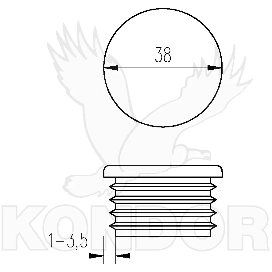 Zátka kruhového tvaru s plochou hlavou pro nasazení na konec ocelové trubky. Materiál plast. Průměr 38 mm. K nasazení na trubku o síle stěny 1–3,5 mm.