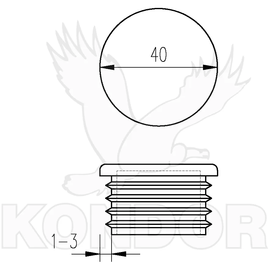 Zátka kruhového tvaru s plochou hlavou pro nasazení na konec ocelové trubky. Materiál plast. Průměr 40 mm. K nasazení na trubku o síle stěny 1–3 mm.