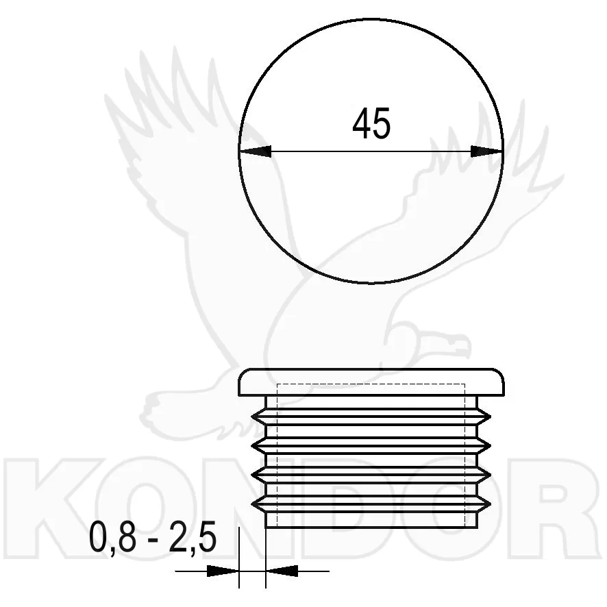 Zátka kruhového tvaru s plochou hlavou pro nasazení na konec ocelové trubky. Materiál plast. Průměr 45 mm. K nasazení na trubku o síle stěny 0,8–2,5 mm.