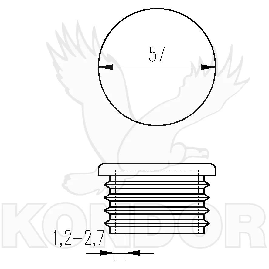 Zátka kruhového tvaru s plochou hlavou pro nasazení na konec ocelové trubky. Materiál plast. Průměr 57,2 mm. K nasazení na trubku o síle stěny 1,2–2,7 mm.