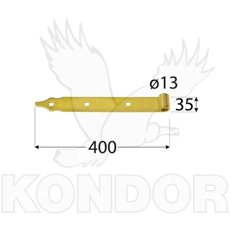Odolný, trvanlivý závěs v provedení galvanizovaného žlutého zinku. Určeno pro vrata, branky, dveře a okenice. Spolu s držákem čepu vytváří komplet (držák není součástí).